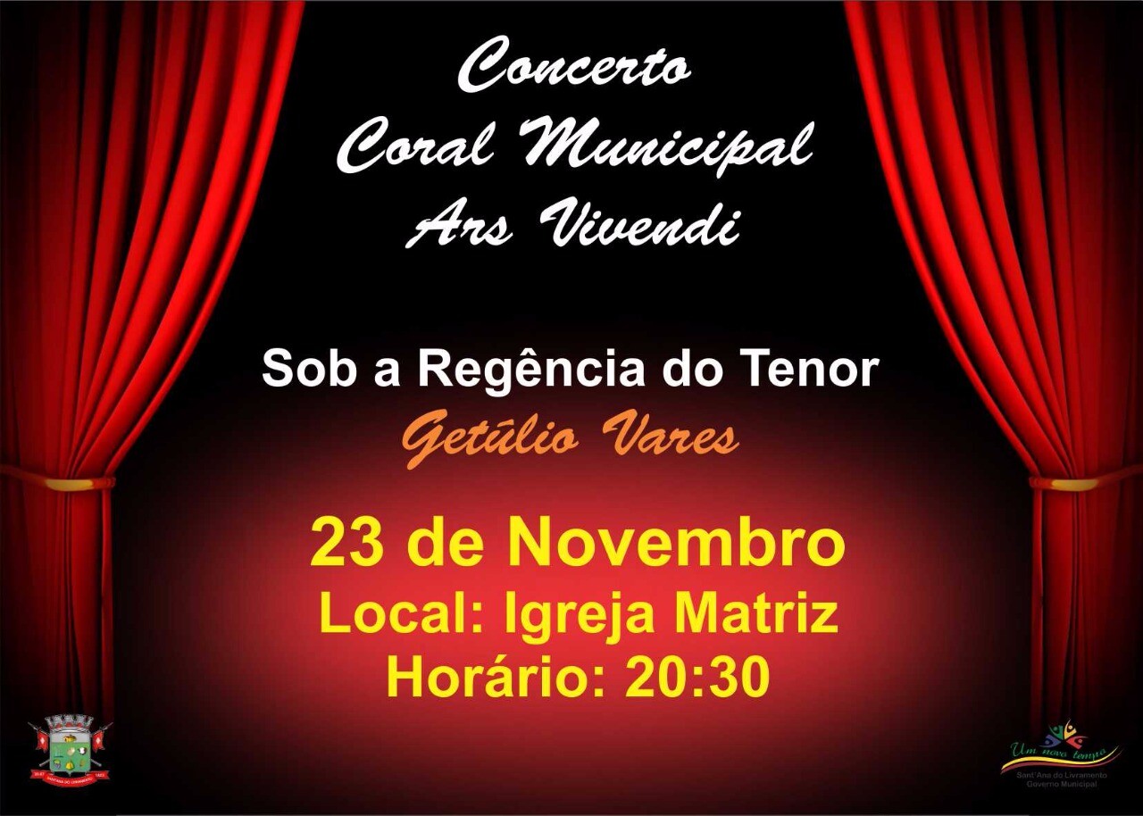 Sob regência do tenor Getulio Vares, o Coral Municipal Ars Vivendi se apresenta nesta quinta-feira (23), às 20h30, na Igreja Matriz. O evento é uma promoção da Secretaria Municipal de Cultura, Esporte e Lazer.