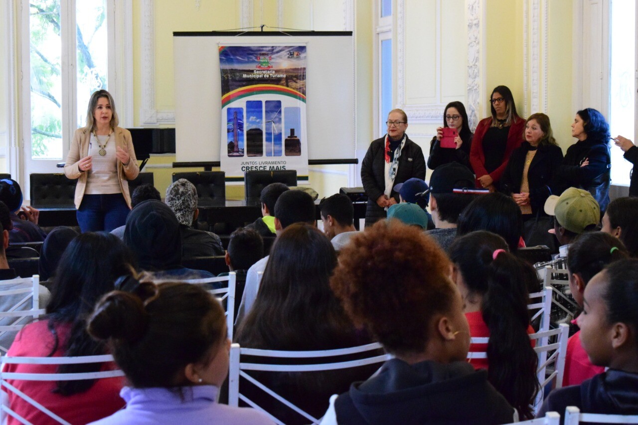 Recebido no Salão Nobre da Prefeitura pelas secretárias de Turismo, Silvana Harden e de Educação, Maria Regina Prado Alves, o grupo de alunos deu início ao passeio por pontos turísticos do município, acompanhados pela guia de turismo, Vera Reis.