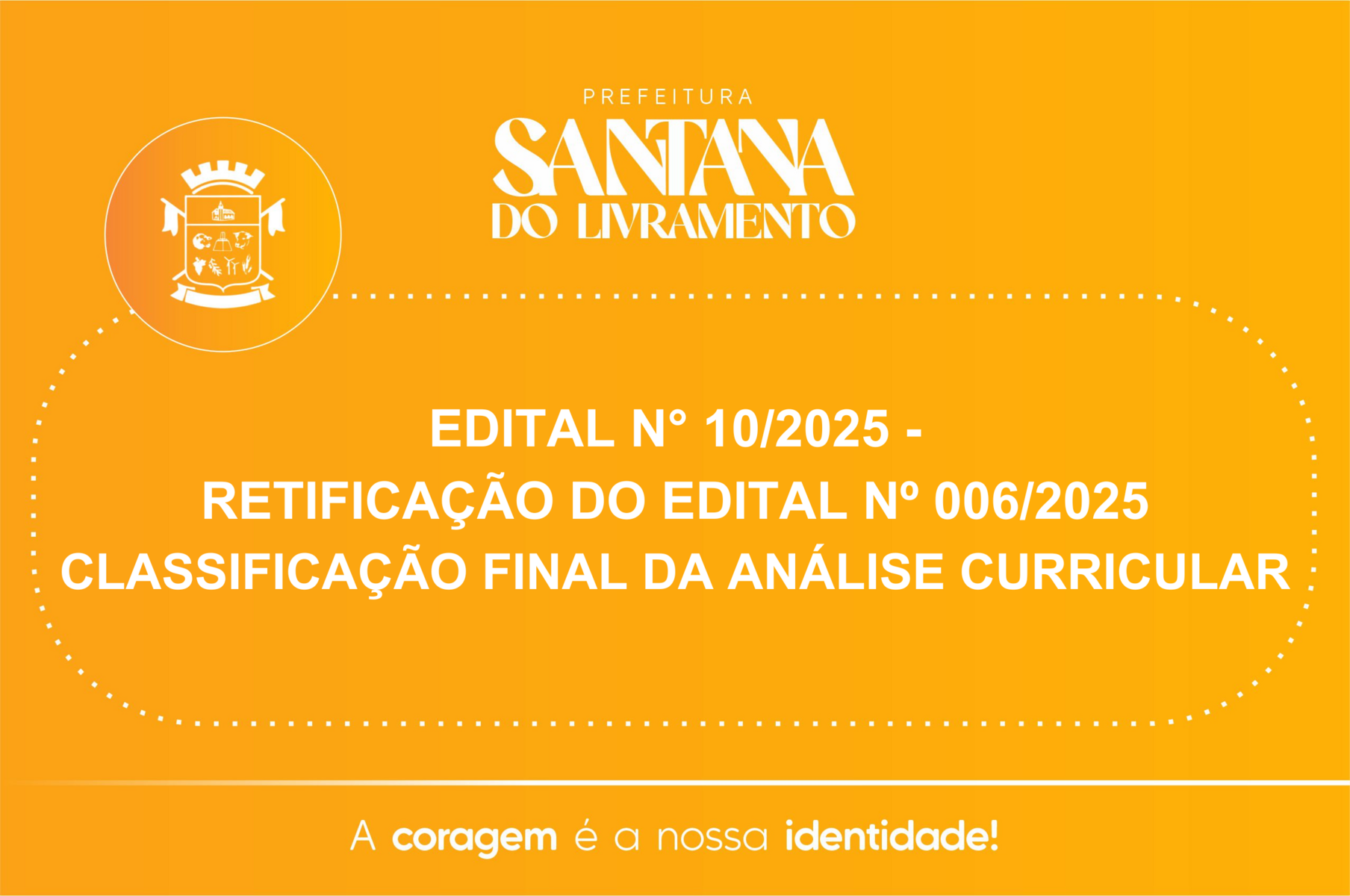 A Secretaria Municipal de Assistência e Inclusão Social de Sant’Ana do Livramento – SMAIS, situada na Rua 7 de Setembro, 515, Sant’Ana do Livramento, através da Comissão Designada pela Portaria nº 794 de 10 de abril de 2025, TORNA PÚBLICA A RETIFICAÇÃO DO EDITAL 06/2025 - CLASSIFICAÇÃO FINAL DA ANÁLISE CURRICULAR do Processo Seletivo Simplificado 02/2025, em observância ao item 2.2. ESTÃO CLASSIFICADOS SOMENTE OS CANDIDATOS QUE ATINGIREM, NO MÍNIMO, 02 (DOIS) PONTOS NA ANÁLISE CURRICULAR.