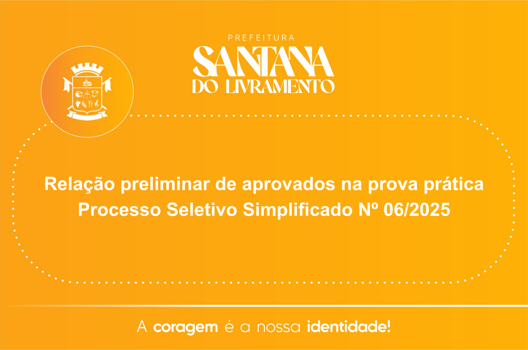 A Secretaria Municipal de Agricultura, Pecuária, Abastecimento e Assuntos Agrários de Sant’Ana do Livramento – SMAPA, situada na Rua Dom Pedro II, 401, Sant’Ana do Livramento torna pública a relação preliminar dos candidatos aprovados na prova prática do Processo Seletivo Simplificado para contratação em caráter temporário e de excepcional interesse público, através de Contrato Administrativo conforme Lei Municipal nº 7.316 de 22 de março de 2018 e Decreto nº 10.285 de 13 de janeiro de 2023, tendo como responsável pela sua execução a Comissão designada pela Portaria nº 1.521 de 1º de setembro de 2025.