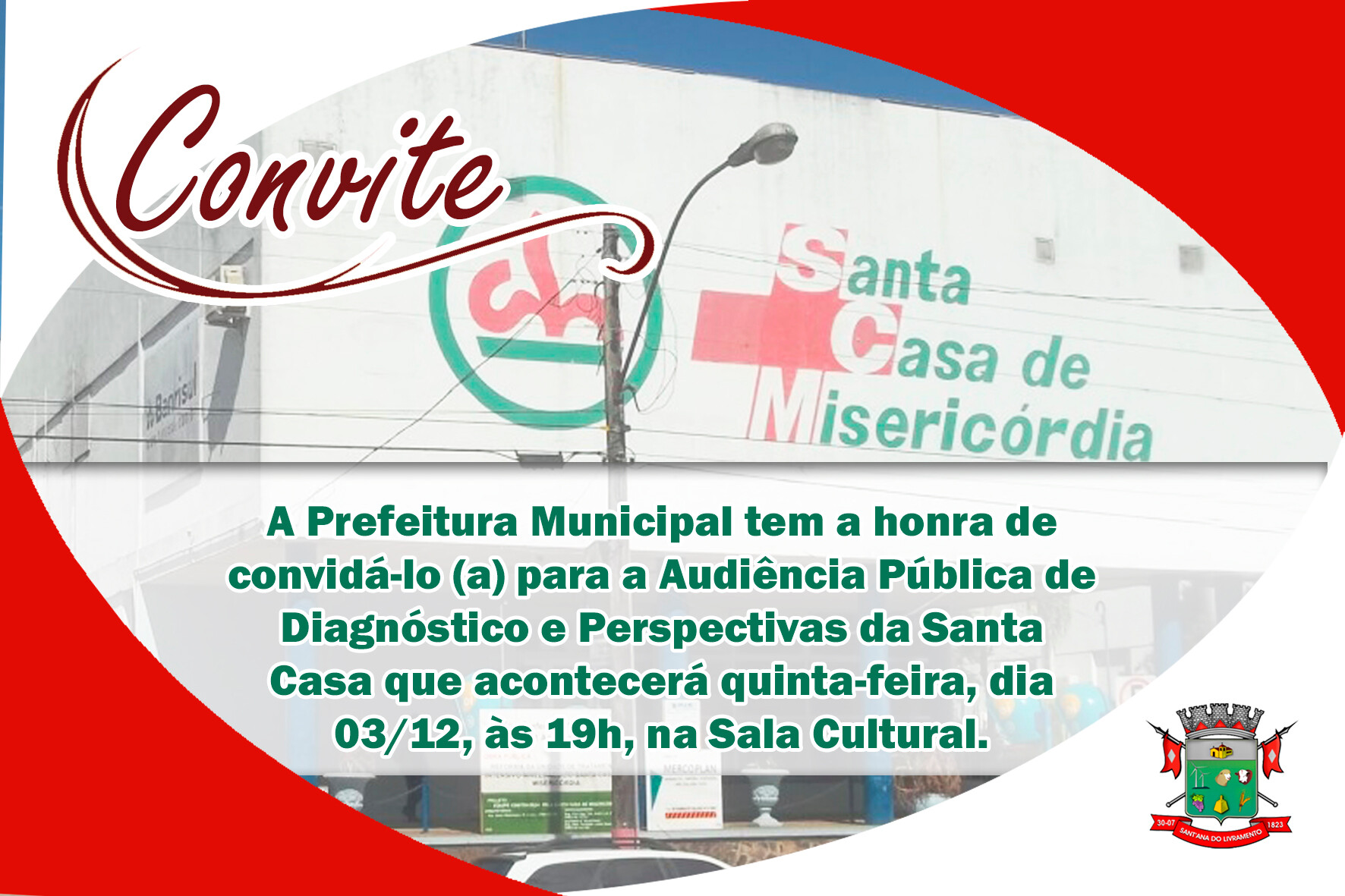 A Prefeitura Municipal convida toda a comunidade santanense para participar da audiência pública de diagnóstico e perspectivas da Santa Casa que acontece nesta quinta-feira, dia 03, às 19h, na Sala Cultural. Para o Prefeito Glauber Lima, “este será um importante espaço para debate acerca do que todos os santanenses desejam para o futuro do hospital”.
