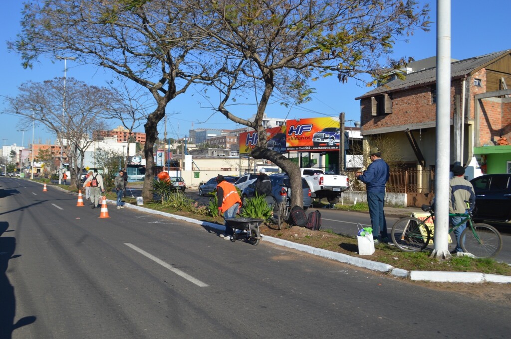 Nesta terça-feira, a equipe de apenados da Secretaria de Serviços Urbanos está trabalhando na pintura do canteiro central da Avenida João Goulart.