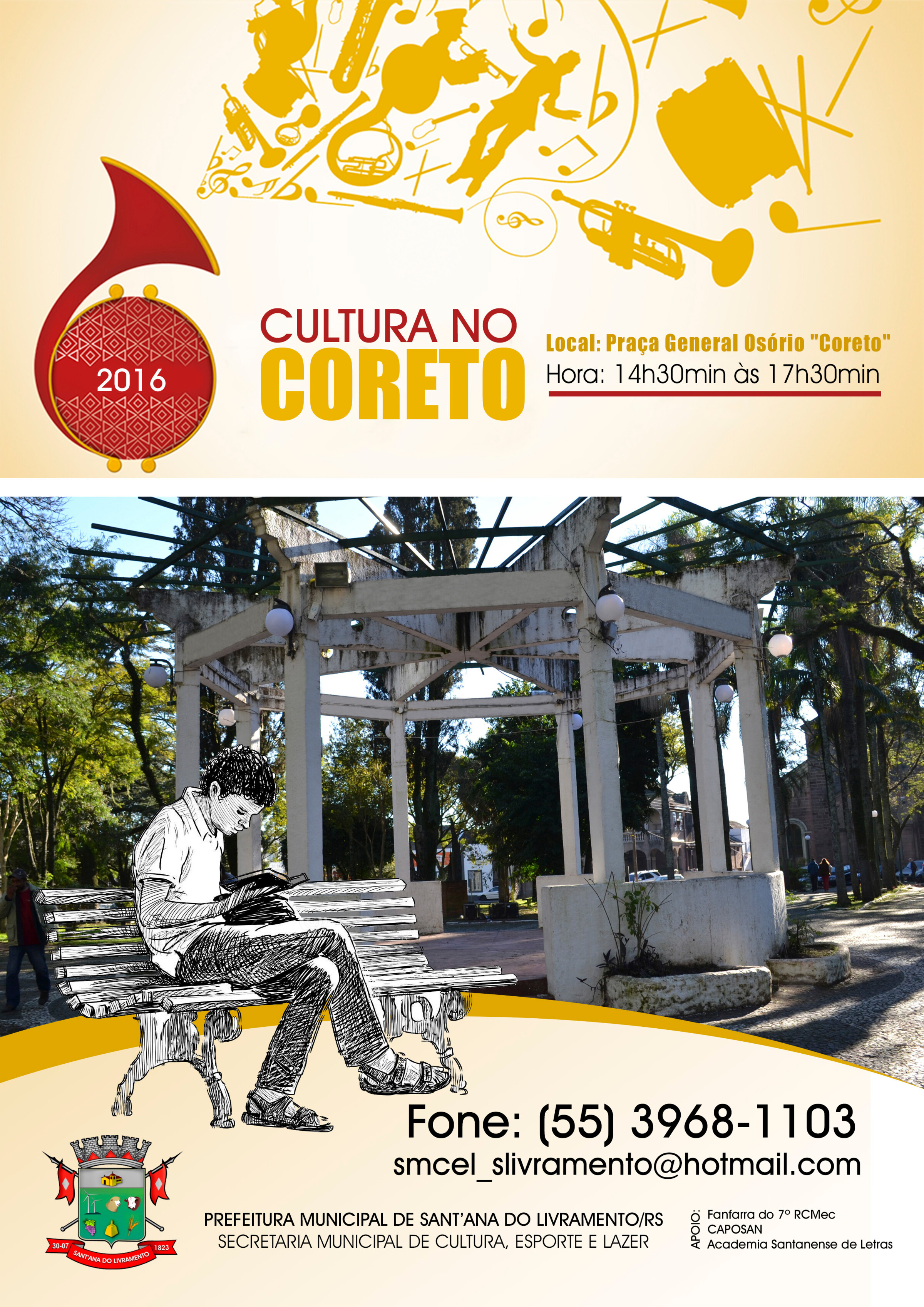 Com o intuito de promover opções de lazer e entretenimento, a Prefeitura Municipal, através da Secretaria de Cultura, Esporte e Lazer, promove neste sábado (13) o evento Cultura no Coreto, na Praça General Osório, a partir das 14h30.
