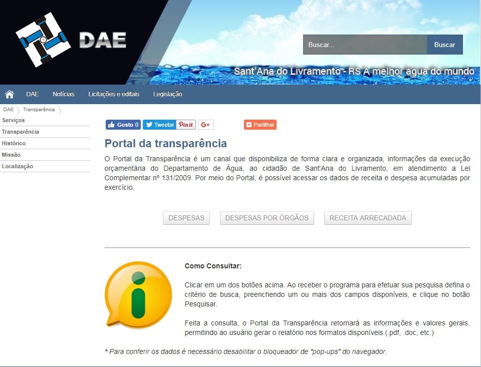 O Departamento de Água e Esgoto (DAE) disponibilizou há poucos dias, informações da execução orçamentária do Departamento, no Portal da Transparência da Autarquia. Instalado no site do Departamento, o portal oferece valores de despesas e receitas, que estão disponíveis para consulta e download.