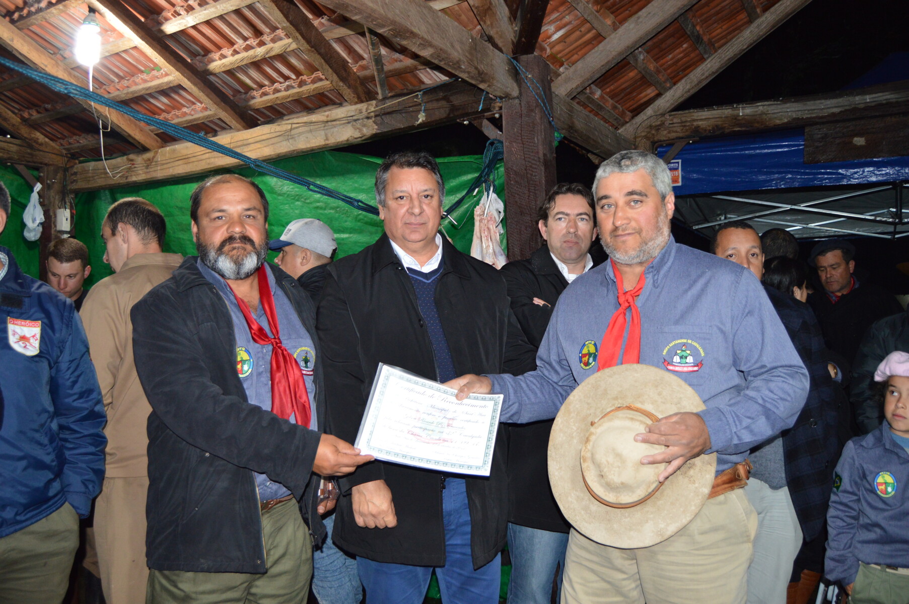 Já nas dependências da Brigada Militar, nesta quarta-feira (13), o Prefeito prestou uma homenagem ao grupo de cavalarianos, com a entrega de certificados de reconhecimento aos participantes da busca da chama. “Me sinto muito honrado de ter a oportunidade de participar e ver que quem participa são pessoas que realmente cultuam a nossa história e a nossa tradição, homenageando nossos heróis farroupilha. Fico feliz em ver este ambiente de integração e de família”, pontuou o Prefeito. Na ocasião, o Grupo também prestou homenagem ao Prefeito, agradecendo o apoio da Prefeitura.