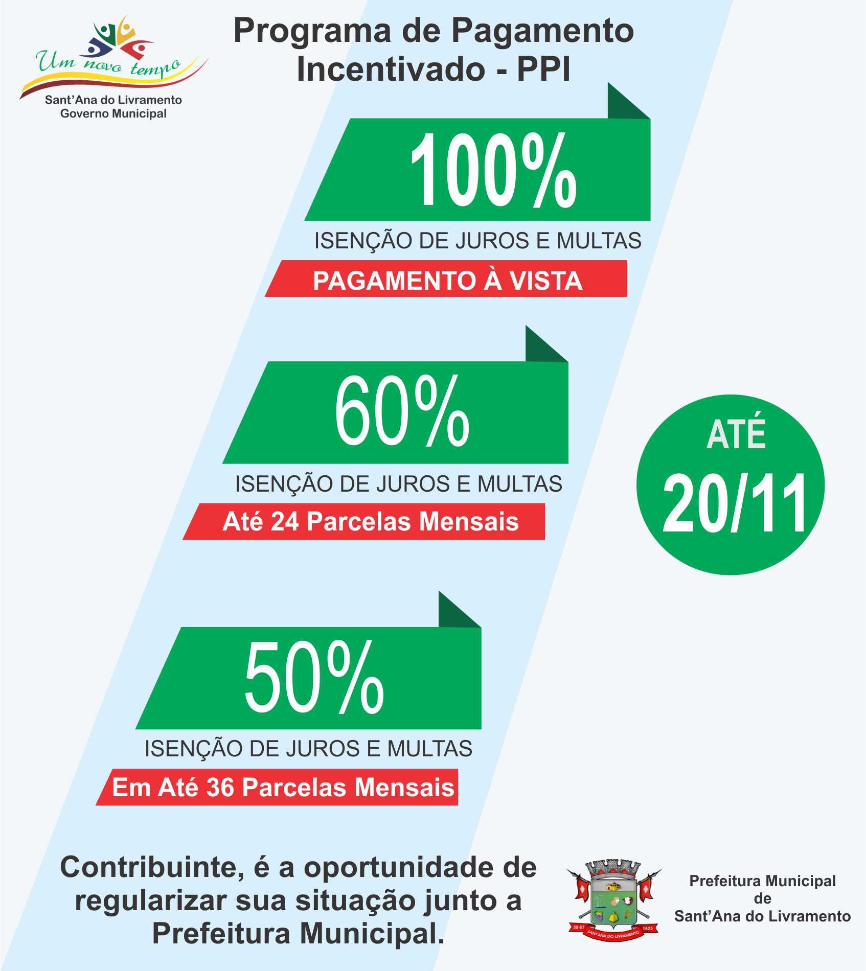 r O contribuinte que tiver débitos com o município ainda tem a possibilidade de regularizar sua situação junto a Secretaria Municipal da Fazenda. Foi prorrogado até o próximo dia 20 de novembro, o Programa de Pagamento Incentivado (PPI) – “Um Novo Tempo”, que possibilita a regularização dos contribuintes que possuem dívida ativa com o município.