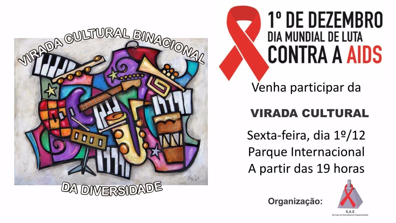 O Serviço de Atendimento Especializado (SAE) convida a comunidade santanense e riverense para a 1ª Edição da Virada Cultural Binacional da Diversidade, que acontece na próxima sexta-feira (1º), a partir das 19h, no Parque Internacional. Realizado no “Dia Mundial de Luta contra a Aids”, o evento tem como propósito dar visibilidade a luta contra a epidemia da Aids e promover ações de prevenção, que serão realizadas em todo o Estado nesse dia.