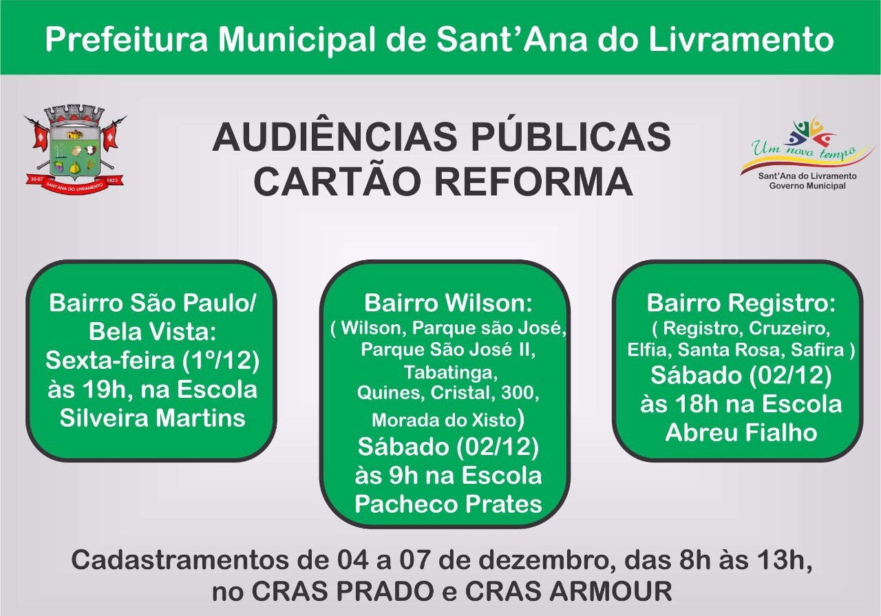 A Prefeitura Municipal de Sant’Ana do Livramento Secretaria Municipal de Planejamento, Meio Ambiente e Habitação inicia nos próximos dias o processo de cadastramento de famílias que poderão receber os recursos do Cartão Reforma, programa do Governo Federal que visa melhorar as condições de moradias das famílias de baixa renda, viabilizando recursos para reforma, ampliação ou conclusão das unidades habitacionais.