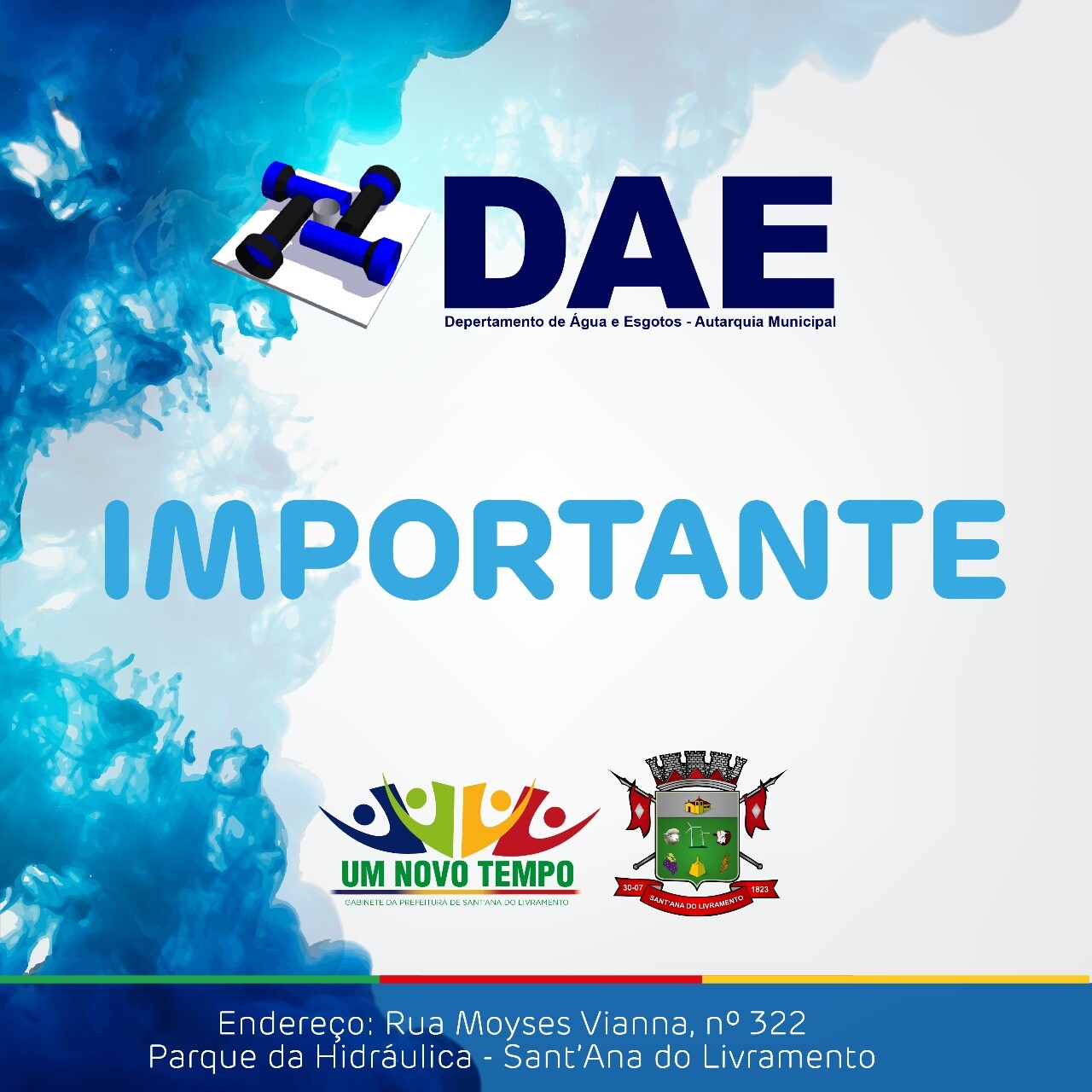 O Departamento de Água e Esgoto (DAE) informamos que os serviços de abastecimento de água poderão ser interrompidos amanhã (17), das 12h30 às 19h, em função de Aviso de Desligamento Programado emitido pela RGESul.