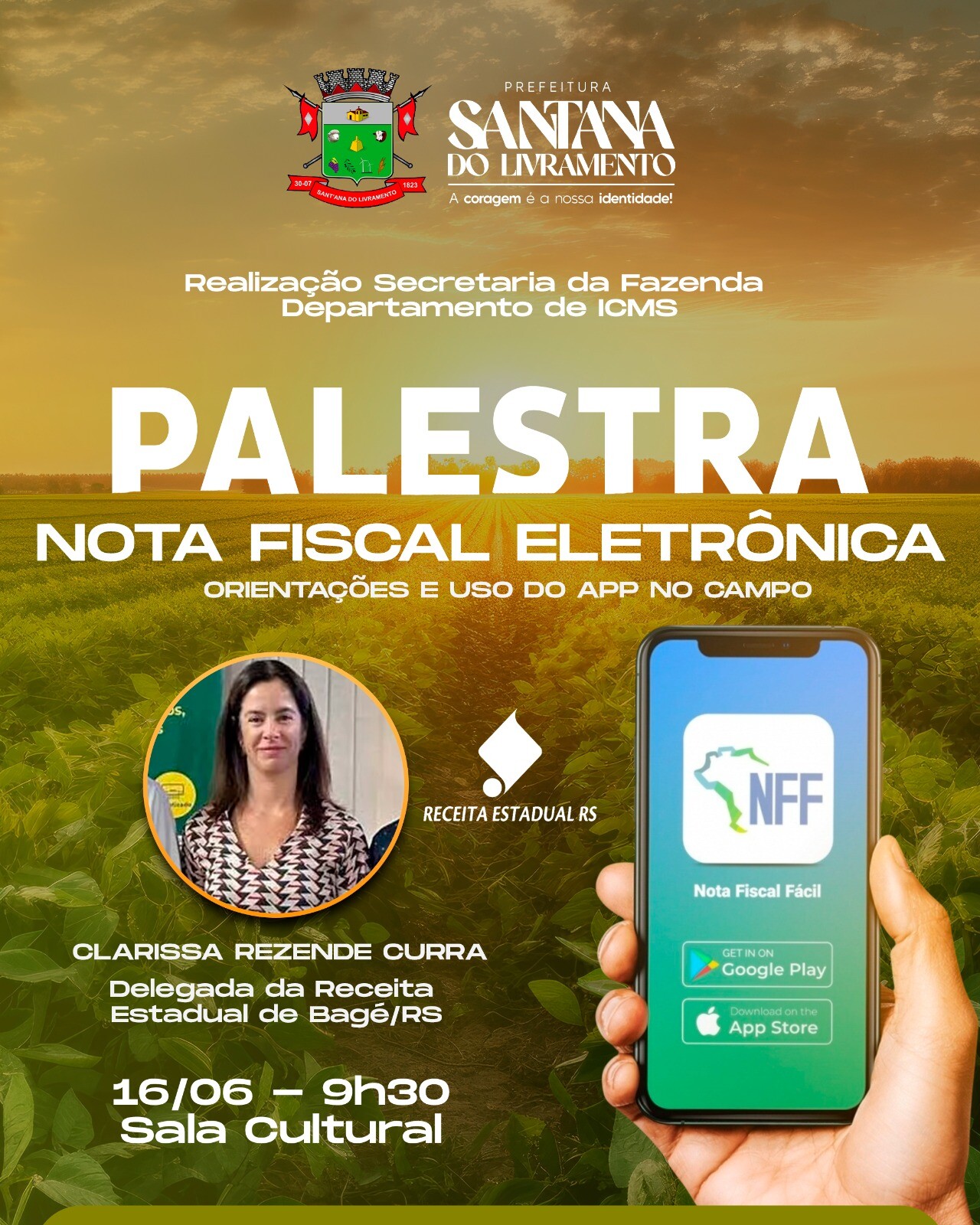 A Prefeitura Municipal de Sant'Ana do Livramento, através do Departamento de ICMS da Secretaria da Fazenda, irá promover uma palestra para os produtores rurais sobre NF-e e uso do App Nota Fiscal Fácil. O evento irá acontecer no dia 16 de junho, às 9h30, na Sala Cultural. Na ocasião, a Delegada da Receita Estadual de Bagé, Clarissa Rezende irá orientar sobre o uso do APP no campo.