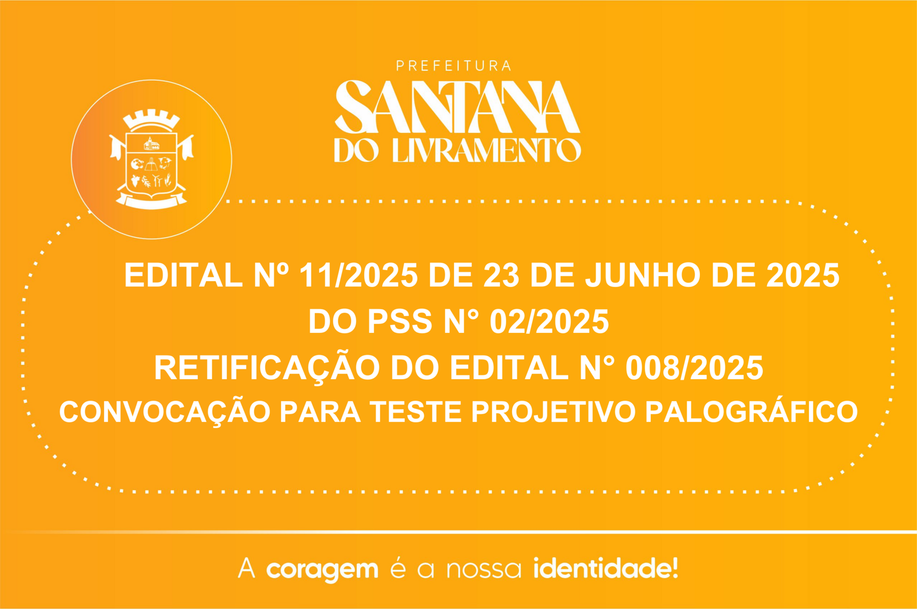 A Secretaria Municipal de Assistência e Inclusão Social de Sant’Ana do Livramento – SMAIS, situada na Rua 7 de Setembro, 515, Sant’Ana do Livramento, através da Comissão Designada pela Portaria nº 794 de 10 de abril de 2025. TORNA PÚBLICA A RETIFICAÇÃO DO EDITAL N° 008/2025 DO PROCESSO SELETIVO SIMPLIFICADO N° 02/2025 – CONVOCAÇÃO PARA TESTE PROJETIVO PALOGRÁFICO. Em observância ao item 11.2, o teste projetivo palográfico será aplicado somente aos candidatos constantes edital n°. 10/2025 que atingiram no mínimo 2,00 (dois) pontos na avaliação da primeira fase, e realizar-se no dia 25/06, na Casa de Cultura Ivo Caggiani (Salão Branco), situado na rua Duque de Caxias, n° 1783, bairro centro.